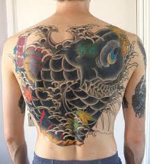 Japanese tattoo designs with koi fish are usually drawn in bright orange and golden hues, combined with the blue sparkling waves in the background. Obviously, it's a beautiful blend of colors, so if you want something that stands out, then this is something you should consider getting.